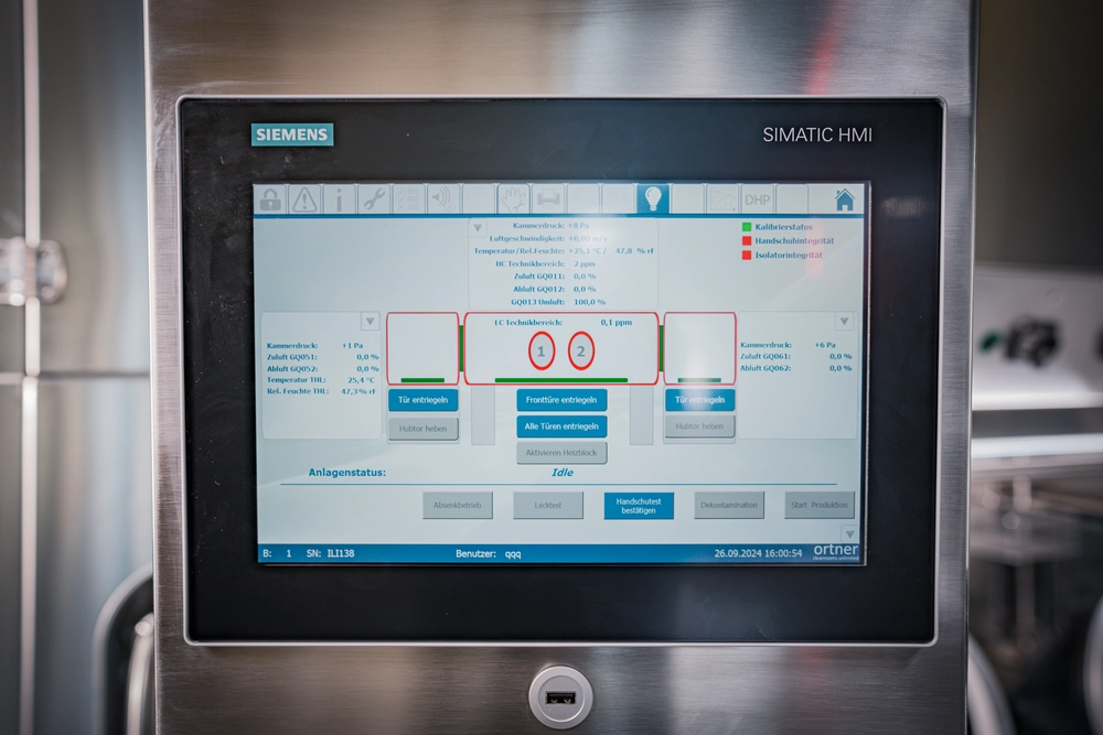 Particle monitoring is a critical parameter in GMP monitoring and is used to monitor air purity. Ortner isolators are equipped with a fully integrated, user-friendly online particle measurement system for 0.5 μm and 5.0 μm particle sizes. The monitoring is active during production operation, with particle concentrations measured continuously throughout the entire production process.